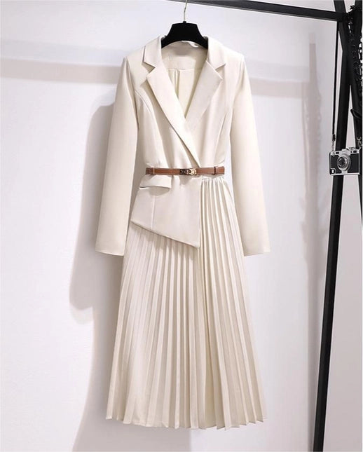 Women Blazer Pleated Dress with Genius Leatther Belt